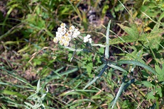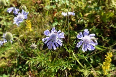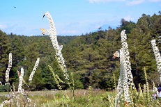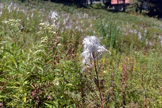 山彦荘の前で昼食を摂り、マナスル荘の前まで歩いてからお花畑に入り、最高点のゲートまで登った。マツムシソウ、コバギボウシ、サワギキョウ、キキョウが咲いていた。ヤナギランは一株だけ花が残っていたが、殆どが綿毛の状態になっていた。ヤナギランの綿毛が一面に広がる眺めはこの日一番の壮観だった。